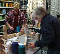 Suzanne Sharpe & Cathy Schikora Eyberger warping their inkle looms.